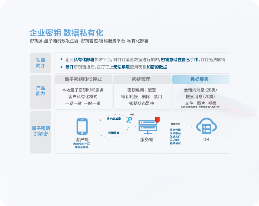 国盾量子和钉钉联合研发的系列产品,在保持客户原有体验的基础上提供更安全的量子加密功能。该产品使用国盾量子提供的量子密钥对钉钉各类消息数据进行加解密,可接入量子零信任安全防护体系,并支持用户将自有的应用系统逐步整合至钉钉门户平台。
